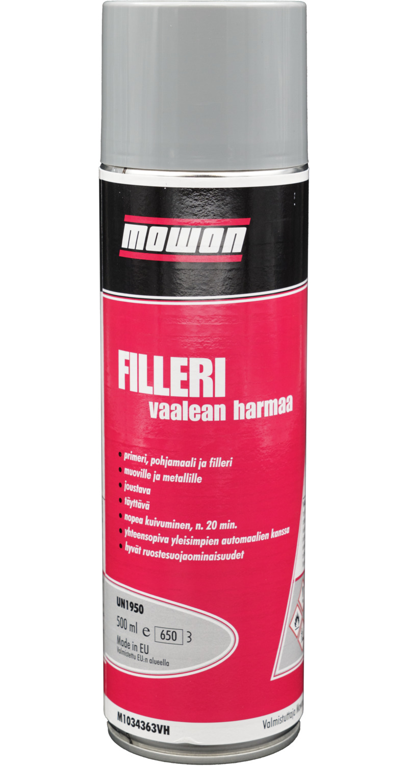 Pohjamaali, primeri, filleri. Automaalareiden kanssa yhteistyössä kehitetty hiottava pohjaväri ja tartunta-aine, joka soveltuu metalleille ja lähes kaikille muovilaaduille. Soveltuu käytettäväksi liuotin- ja vesipohjaisten maalien kanssa. Kilpaileviin tuotteisiin verrattuna Mowon 1K Filleri sisältää täyttöainetta noin 10% enemmän ja on siten taloudellisempi. Ruostesuojaominaisuuksia on parannettu lisäämällä sinkkifosfaattia seokseen. Värivaihtoehtoja on kaksi; tumman harmaa, jonka värikoodi on RAL7011 ja vaalean harmaa RAL7042. Jokaisen pakkauksen mukana tulee täyttösuutin, jolla nimensä mukaisesti suihkutetaan raskaampia täyttöjä sekä viuhkasuutin ohuille kerroksille. Varastotuote.
